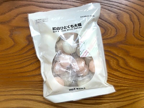 モチモチ食感好きにおすすめしたいのが「紅白ひとくち大福」(350円)。いちご味のもち生地とプレーンのもち生地で餡を包み紅白に仕上げています。筆者が購入したものは紅が8個、白が7個入っていました。