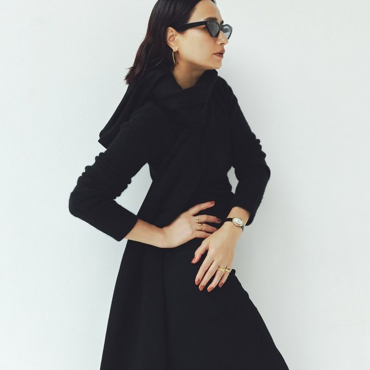 時計:ベニュワール[YG×クオーツムーブメント]¥1,808,400、イヤリング:ジュスト アン クル[YG×DIA]¥1,293,600、リング:ジュスト アン クル〈右手中指〉[YG×DIA]¥946,000、〈右手薬指〉[YG×DIA]¥737,000、クラッシュ ドゥ カルティエ〈左手薬指〉[PG]¥671,000、トリニティ〈左手小指〉[WG×PG×YG]¥342,100(全てカルティエ/カルティエ カスタマー サービスセンター)、ニットトップス¥50,600、スカート¥121,000、ストール¥68,200(全てヨー ビオトープ/ビオトープ)、サングラス¥41,800(シーロン)