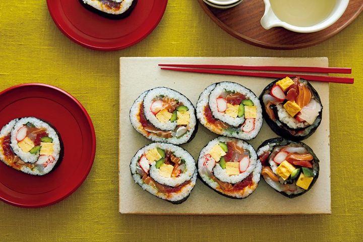 ④ごはんの手前側1cm分を空け、きゅうり1本を皮を下にしてのせる。厚焼き卵1本、カニ風味かまぼこ、鯛、サーモン、まぐろのそれぞれ半量を順に並べる。残りの半量をとびこの上にのらないように同様の順番で並べる。手前を持ち上げ、一気に巻く。巻き終わりを下にして、巻きすに巻いた状態で15分ほどおいてなじませる。