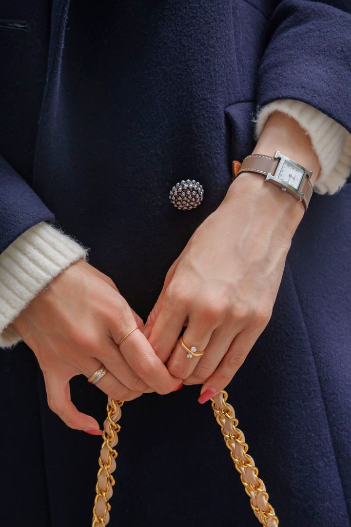 ring/Cartier(右手薬指)、H.P.FRANCE(右手人差し指)、NO BRAND(左手中指) watch/HERMÈS earrings/NO BRAND