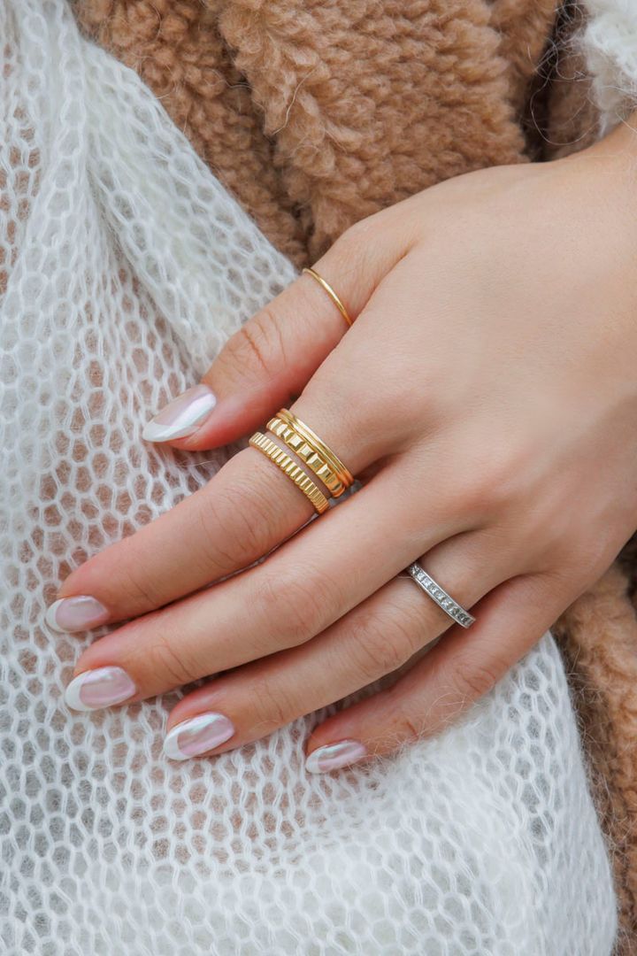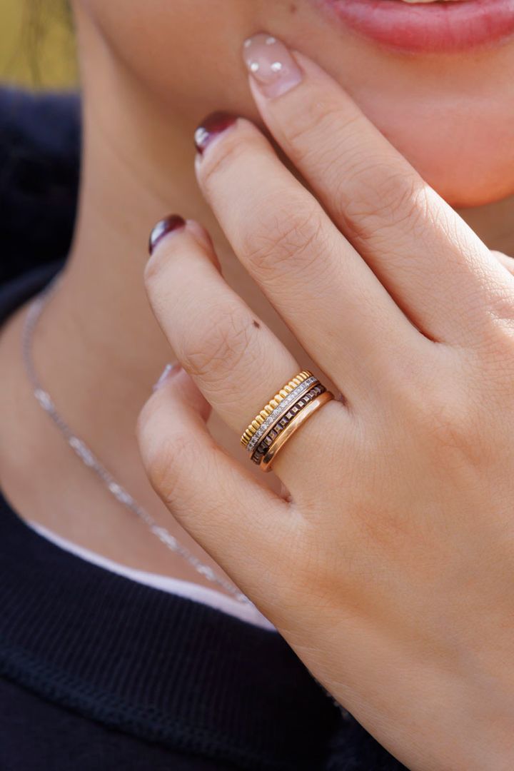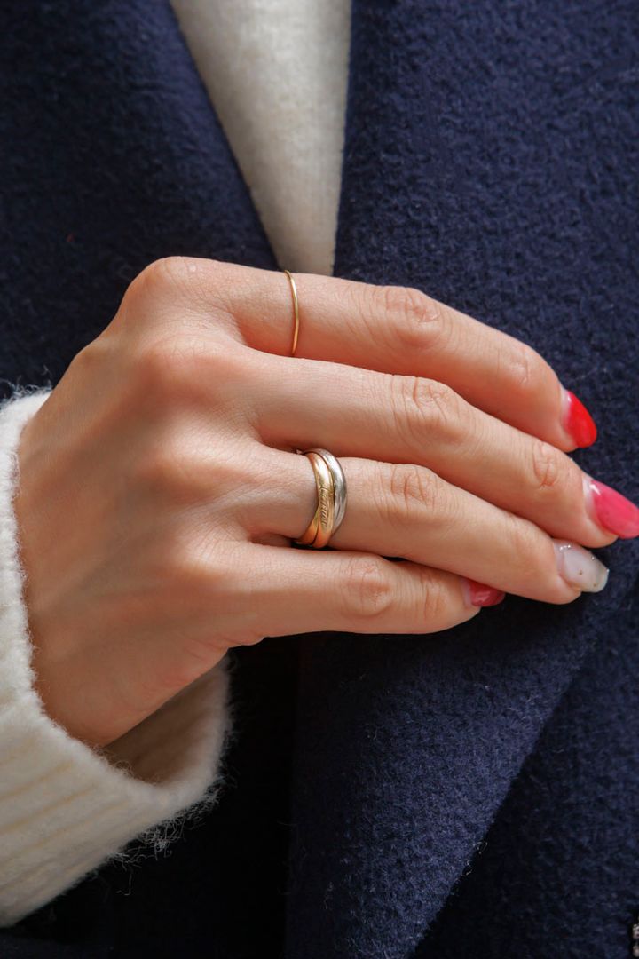 「今年3人目を出産したので、記念にトリニティリングを購入しました。決め手は、3つのリング1つずつに子どもの名前を刻印できたこと。自分だけの特別感もあり、宝物です。左手のエタニティリングはティファニーで、重ねたイエローゴールドはノーブランドですが、トリニティに合わせてイエロー×ホワイトミックスするのが好きです」小野原瑞季さん・27歳(5歳と2歳の男の子、0歳の女の子ママ)