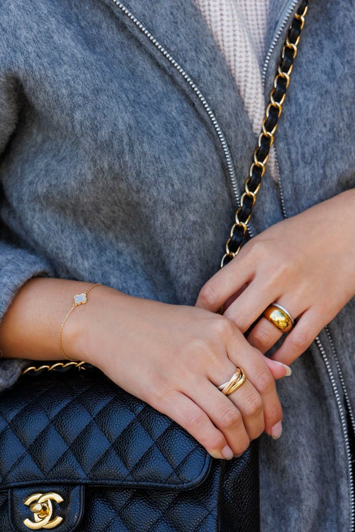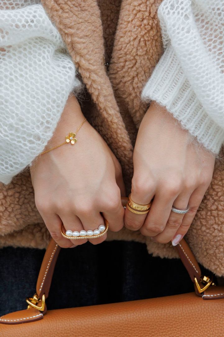 「キャトルリングはオープンリングになっているデザインで、人と被りにくいのでお気に入り。バッグの金具に合わせて、イエローゴールドメインの手元にまとめました。カジュアルな印象のコーディネートなので、パールリングとフリヴォルのブレスで華やかさをプラス」伊藤杏実さん・36歳(6歳の男の子ママ)