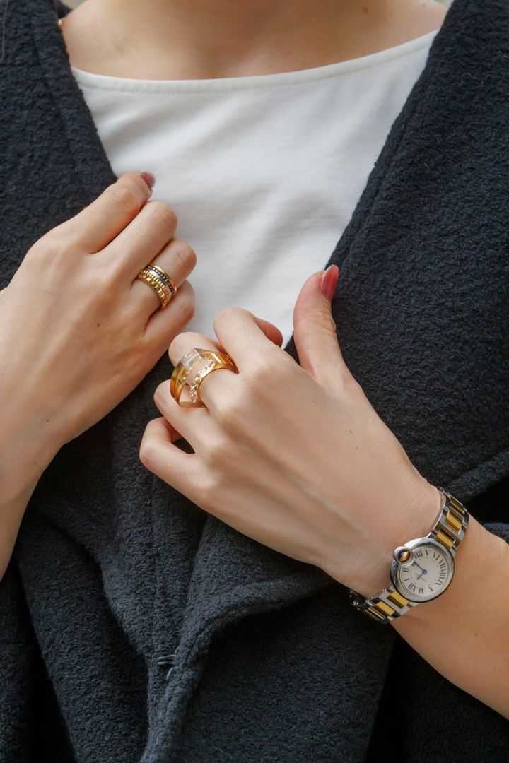 「10年くらい前に購入しましたが、今も変わらず愛用しています。何年経っても飽きがこないデザインはさすが!ひとつで十分ボリュームがあるので右手にはキャトルのみ、左手には最近お気に入りのジュティクのクリアリングを合わせてバランスを取ります」大矢朋子さん・37歳(5歳の女の子ママ)