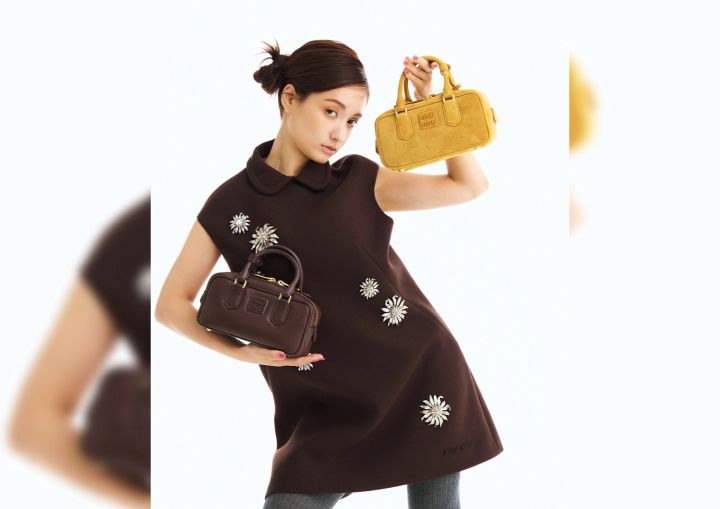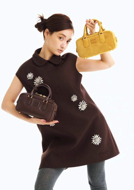 アルカディ バッグ[W22×H10.5×D7.5]各¥396,000、ドレス¥1,001,000、タイツ¥124,300(すべて予定価格)/以上ミュウミュウ(ミュウミュウ クライアントサービス)