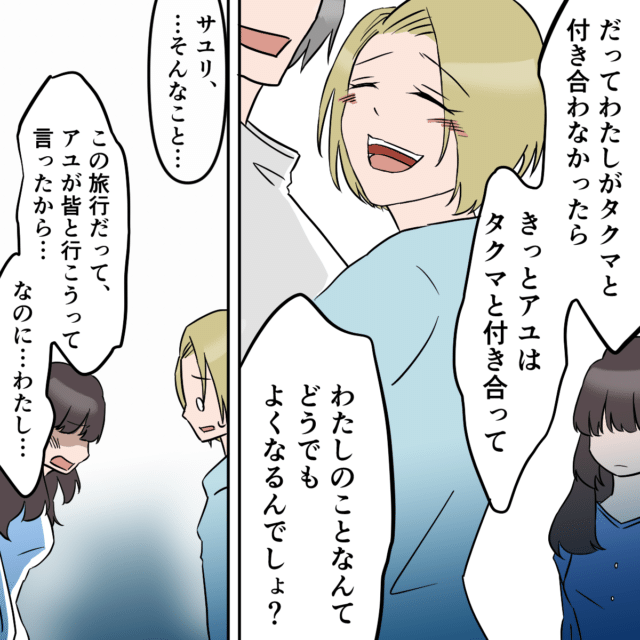 「ほーらアユ。これがサユリの本性だよ。」タクマはアユの肩を抱いて勝ち誇ったように言いました。複雑な状況で、アユがまず口にしたのは「サユリ・・・私の気持ち知ってて、それで」