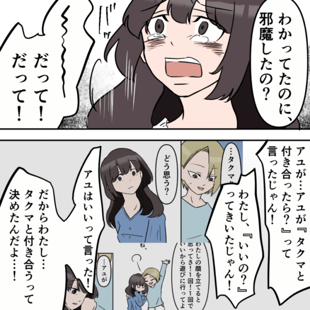 「私、『いいの?』ってきいたじゃん!アユはいいって言った!だから私・・・タクマと付き合うって決めたんだよ!」