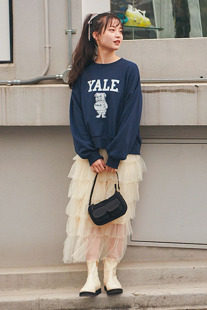 ネイビーのスエット×甘々チュールスカートが旬なコーデ。ブーツをチュールにあわせてこなれ感アップ♡