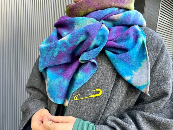 毛織物の産地、尾州・一ノ宮で織られているという薄手のウール地が、なんとも肌触りのよさそうな大判ストール。美しい発色は、「日本の伝統色を、京型友禅で染め上げています。巻き方によって柄の出方が異なるので、楽しいですよね」と山本さん。