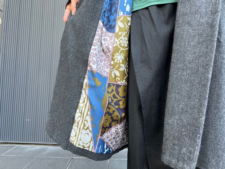 着物の長羽織のような、たっぷりとした丈のあるコートが長身の山本さんにとてもお似合い。「とくに、裏地が気に入っています」。藍や茶のダークな無地が多い男着物も、実は羽織裏や襦袢で遊ぶのがおしゃれ。そんな、日本らしい粋な感覚を、冬のモノトーンコーデに取り入れています。