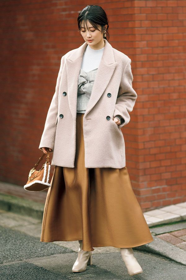 ビスチェ¥18,700/マイストラーダ コート¥23,991/NATURAL BEAUTY BASIC ニット¥7,920/PROPORTION BODY DRESSING スカート¥25,300/ジャスグリッティー イヤリング¥24,200/masae(ロードス) バッグ¥11,900/CHARLES & KEITH 靴¥28,600/ダイアナ(ダイアナ 銀座本店)