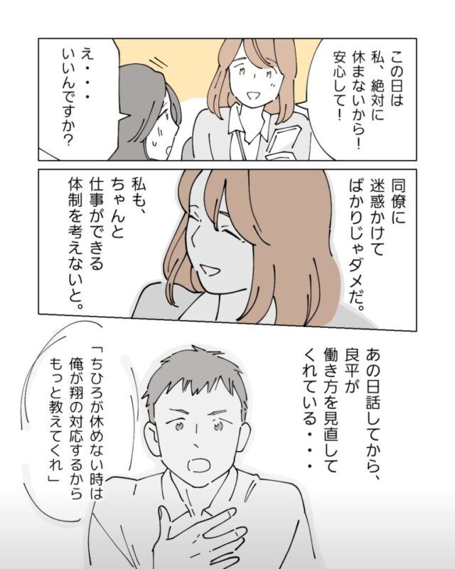 良平さんのメッセージを確認したちひろさんは、「この日は私、絶対に休まないから安心して!」と亜美さんに伝えました。「え・・いいんですか?」驚く亜美さんに笑いかけながら、「同僚に迷惑かけてばかりじゃダメだ。私も、ちゃんと仕事ができる体制を考えないと」と心の中で思うちひろさん、「あの日話してから、良平が働き方を見直してくれている・・」そう思いながら、良平さんの「ちひろが休めない時は、俺が翔の対応するからもっと教えてくれ」そう言った言葉を思い出していました。