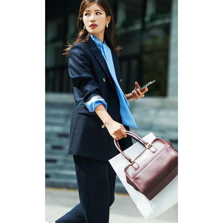 ブルーの力を借りて知的さと洒落感を完備。仕事シーンでも好印象かつ自分のオシャレ欲も満たせる絶妙バランスに。袖を捲ってブラウスを覗かせるのもこなれる技。