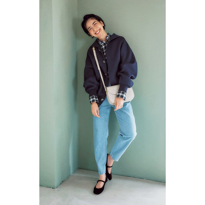 デニムを穿きたいアクティブDAYも、好相性なブルゾンもセーラーカラーを選べば、ほんのりガーリーな甘さがプラス。足元は抜け感のあるメリージェーンで。