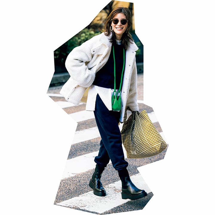 車で行ける近場の温泉に一泊旅行へ。短め丈のボアコートは車の乗り降りがしやすく、重心が上がってスタイルアップして見えるのが魅力です。スウェットがカジュアルに偏らないよう、シャツを挟んできちんとした印象に整えるのが大人見えのコツ。鮮やかな極小グリーンバッグをアクセントとして効かせるワザも◎。