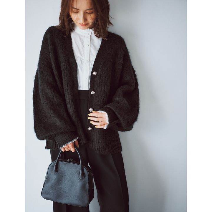 日中と朝晩との寒暖差対策のために、簡単に着脱できるアウターをチョイス。デニムのカジュアルコーデの日も、トレンドのシャギーカーディガンを羽織れば、程よくキレイめに。ぽってり感が目を惹くトートバッグをアクセントにして、抜け感をプラス。