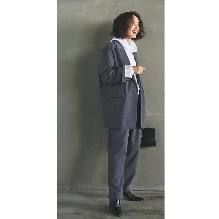 本気のダウンだと防寒最優先、〝スキー〟の人になっちゃいがち。きれいめコートでカジュアルを中和するのが◎。彩度の異なるグレーを重ねて大人っぽく。パンツもセンタープレスのテーパード、とことんきれいめに振った方が普段履きしやすい!