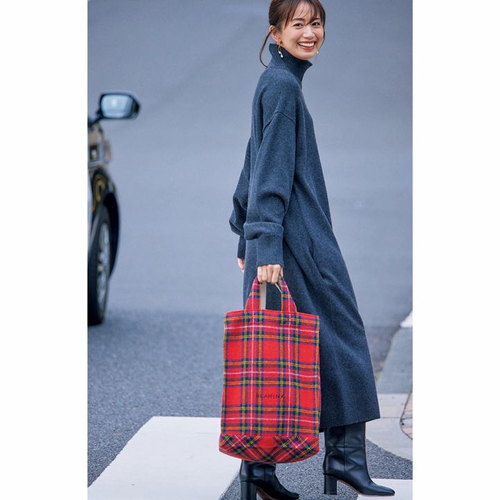 ご近所へのお出かけならアウター要らず!冬に取り入れたくなる赤のチェックバッグを一点投入すれば、いつもの冬服を一気にアップデートしてくれます。