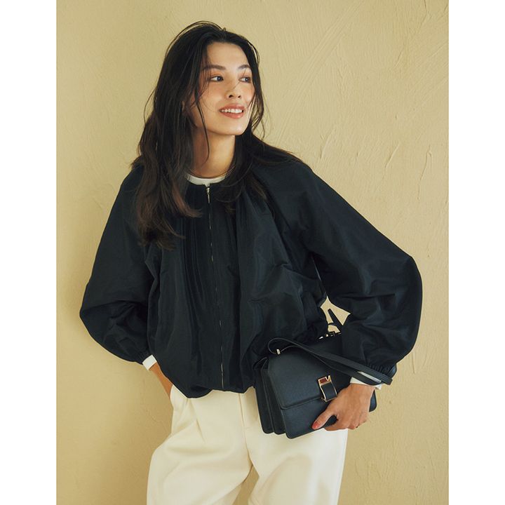ライトアウターの代名詞でもある「ブルゾン」も、光沢感×袖コンシャスで上品仕上げに。白パンツと合わせてきちん感の中にも程よい抜け感をプラス。
