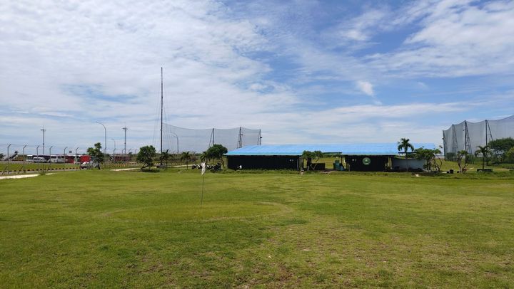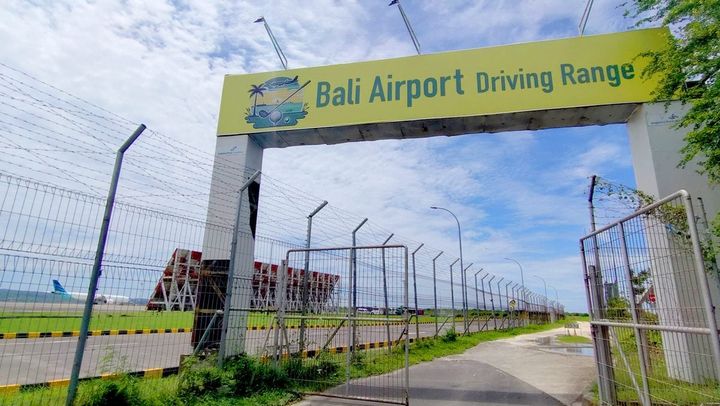 観光の拠点となるクタからバイクタクシーで約20分。デンパサール国際空港の滑走路が真横に位置する場所に、Bali Airport Driving Rangeはあります。到着してまず目に入るのは、空港の外周フェンスと、その向こうに見える旅客機の姿。青い屋根の建物が練習場で、アプローチ練習場も併設されています。