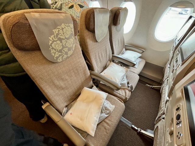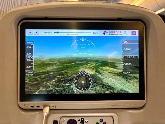 上海からローマへの往復フライトに使われた「エアバスA350-900」は新しい機材で、清潔感があります。座席のヘッドレストの両側が前方に倒せる仕様になっているため、ネックピローが無くても頭頂部が固定されて楽な姿勢が取れました。