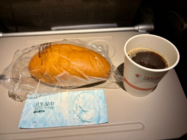 往路の3回目はあまりお目にかかれない、サバのような魚系のペーストを塗ったロールパンと飲み物も。味はともかくとしても満足感は十分!