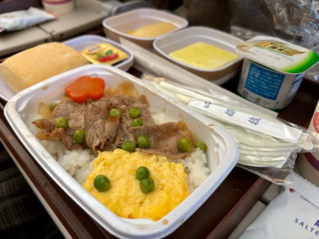 肉がたっぷりと入ったメイン料理のほかに、サラダ、果物、デザート、加えて温かいロールパンも配られ、マーガリンを塗って食べればボリュームのあるセット料理のよう。