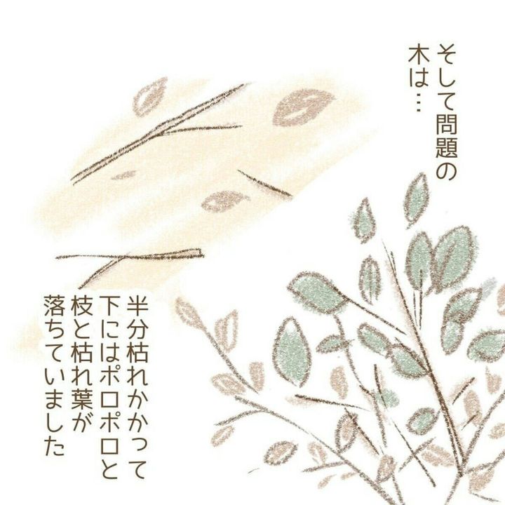 学校で「誰かが枝を折った」と問題になっている木を確認しに行った息子と父。実際に見てみると、想像とはだいぶ違う枯れ木でした。現場を確認するのは大切ですね。