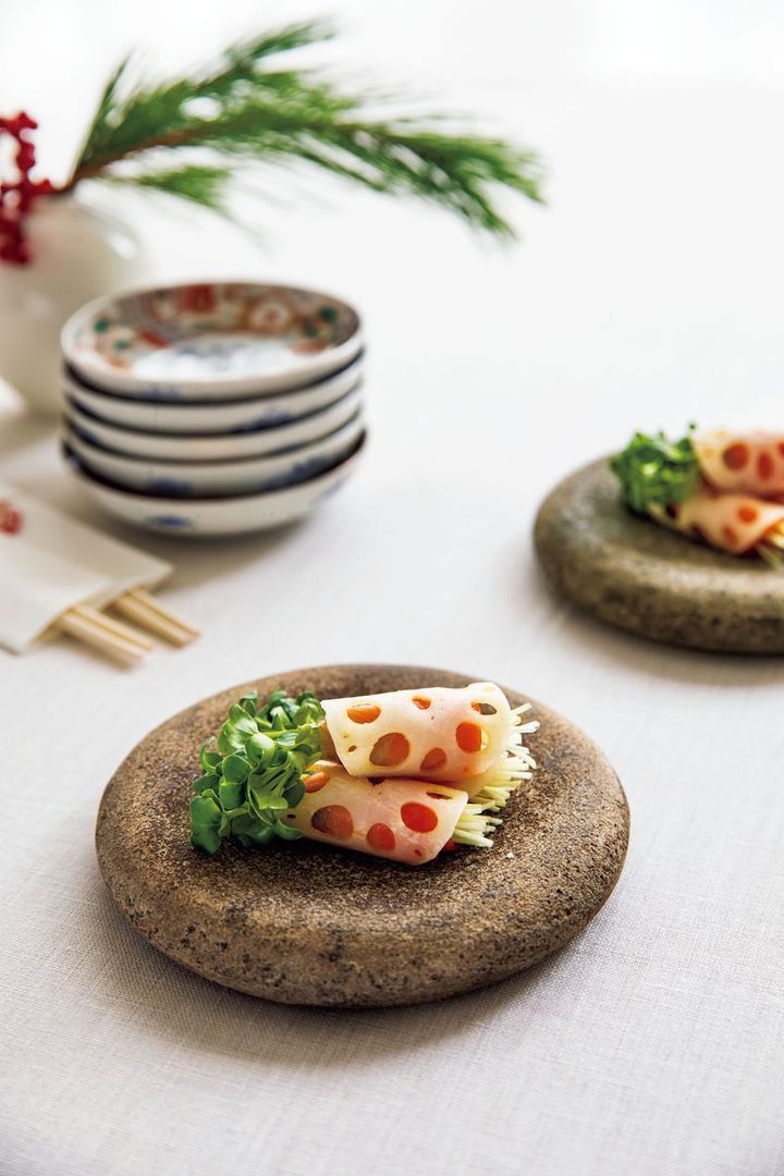 れんこんと貝割れの、ふだん使いの野菜をひと工夫。見た目が華やかになるので、お正月のおせちの中の一品や、おもてなしのときの一品に作ってみませんか?