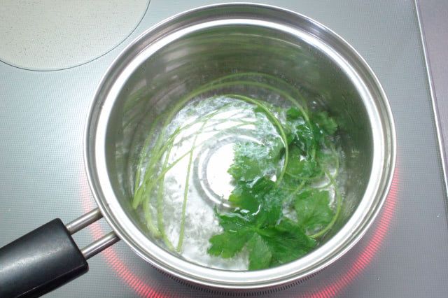 三つ葉は結ぶので、やわらかくなる程度に20秒ほど茹で、氷水に浸けて色止めしました。