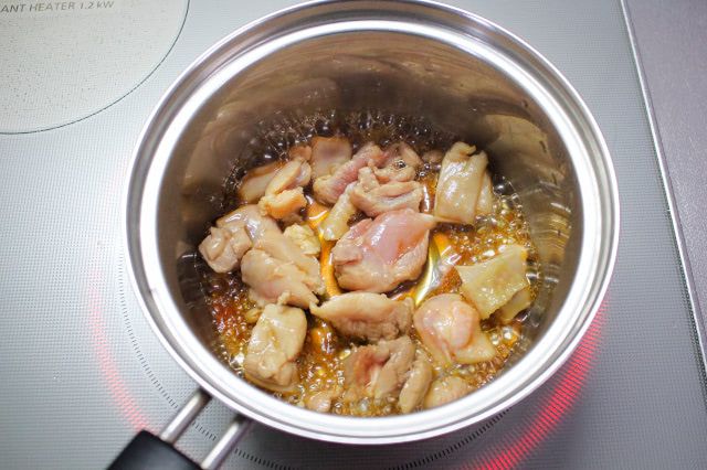 3. 鍋に鶏肉、酒、しょうゆ、みりん、砂糖を入れて、中火で火が通るまで炒りつけます。