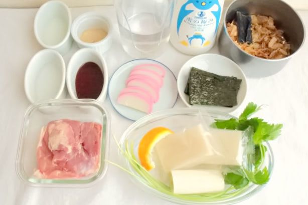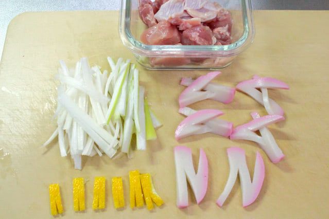 1. 長ねぎは5cm長さの細切り、ゆずの皮は白い部分を少しそいで、松葉切りにします。かまぼこは、切り込みを入れて松葉飾りにしましょう。鶏肉は、小さめのひと口サイズに切っておきます。