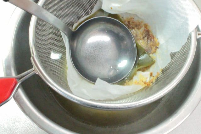 5. キッチンペーパーを敷いたザルでだしを濾し、上からお玉で絞ります。