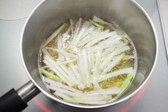6. 鍋に5を注ぎ、塩、3の煮汁をお好みの量だけ加えたら、長ねぎをサッと煮ます。