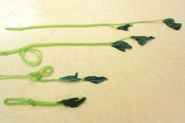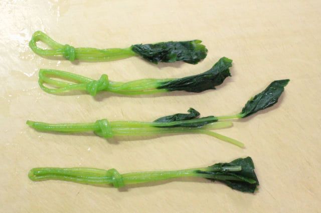 2. 三つ葉をサッと茹でて、氷水で色止めします。水気を切ったら2本を1組にして、片結びにします。