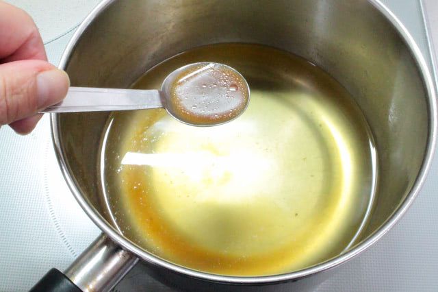 だしに、鶏肉を炊いた煮汁を適量、加えます。今回は煮汁が少なかったので、小さじ2杯分を加えて混ぜ、中火で温めました。