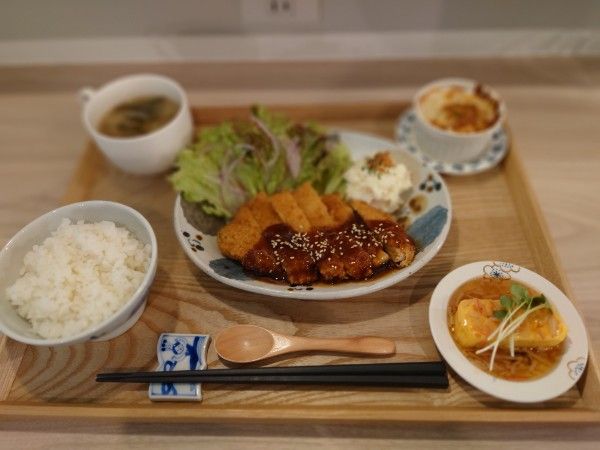 今日は メインがポークカツ(おろしソースか濃厚ソース)私は濃厚ソースをチョイス! だし巻きたまご〜和風あんかけ〜 ポテトサラダ グラタン お味噌汁 ご飯(白米か雑穀米選べます)今回、雑穀米は売り切れで白米をチョイス ドリンク付でさくらんぼソーダを食後に注文しました。