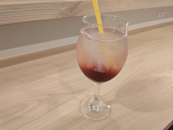 ドリンクは、「さくらんぼソーダ」をチョイス、見た目がとってもキュートで写真が撮りたくなる感じ!下に沈んだシロップを混ぜて飲みます。