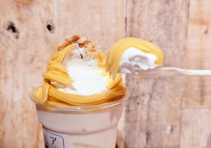 目を引く金色のモンブランの上にはクルミだトッピングされています。