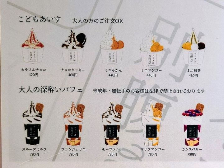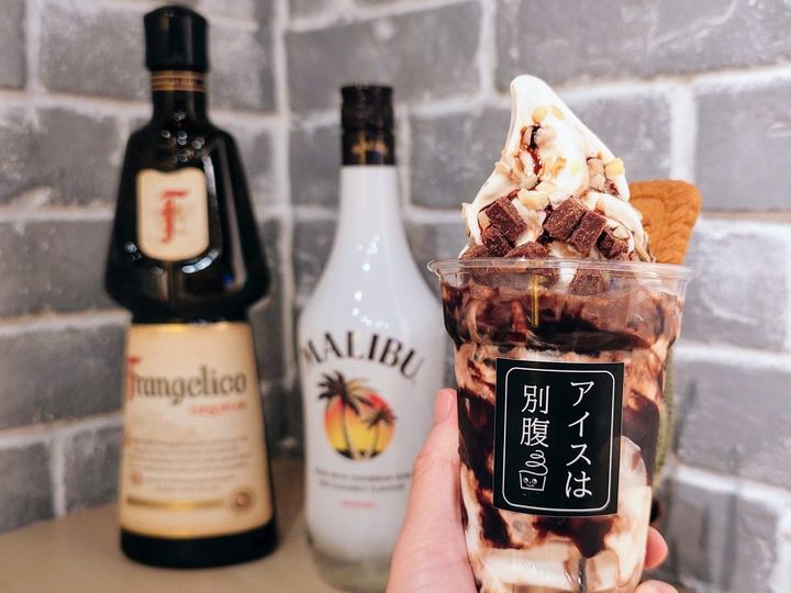 ソフトクリームにリキュールをかけた「大人の深酔いパフェ」シリーズ(各税込780円)もお店の特徴です。コーヒーゼリー系、キャラメル系、フルーツ系などあります。
