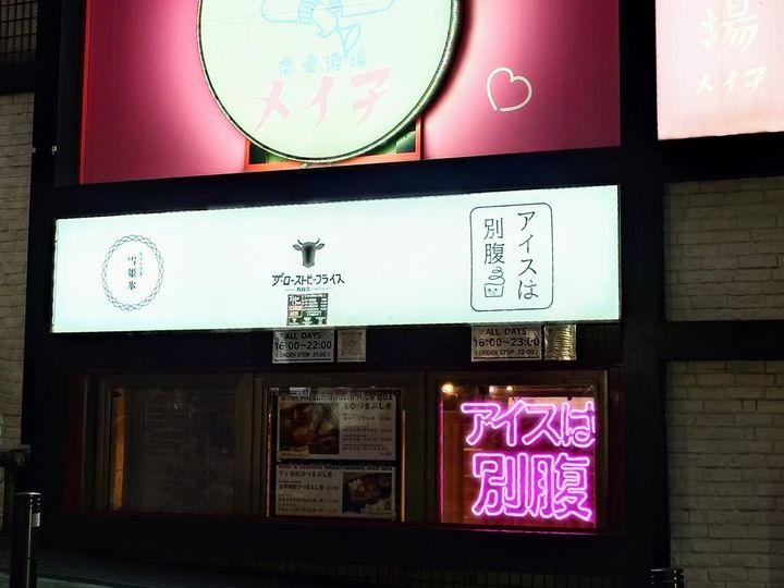 今回、渋谷駅直結の商業施設「渋谷ヒカリエ」の隣にオープンした「アイスは別腹 渋谷店」に訪問。暗い夜に輝くネオン管の「アイスは別腹」がお店の目印。