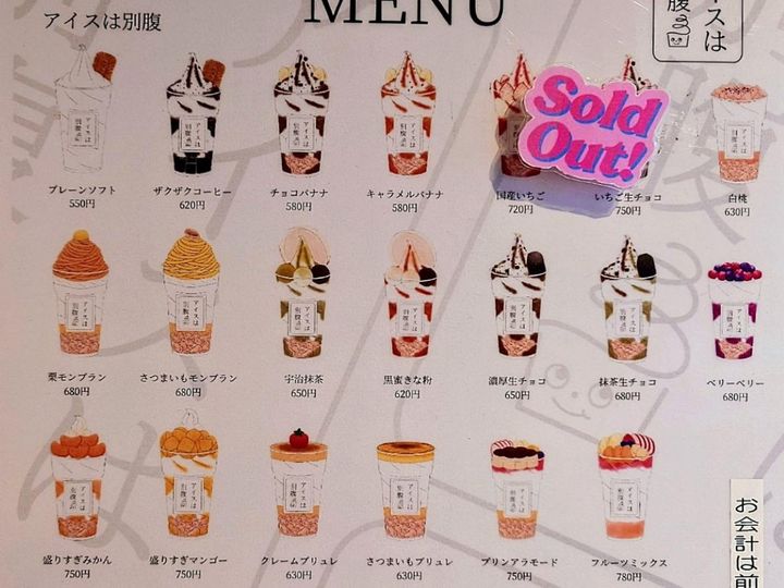 お店の前にはメニュー表が置いてあります。前払い制なので、入店前にどのアイスにするかを決めて扉を開けましょう。