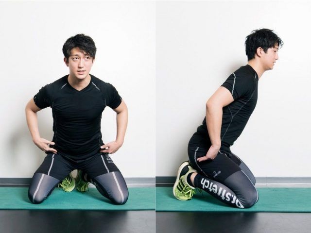 (2)股関節を前に引き出すイメージで、骨盤を起こすように前傾させる