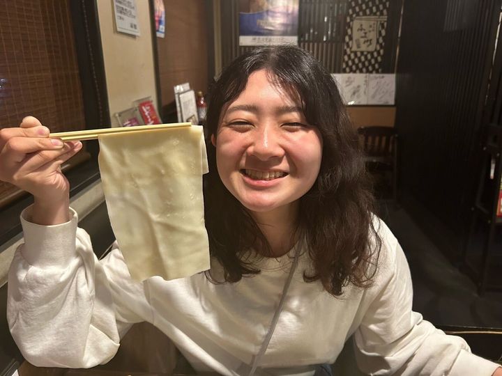 試しに、その形のまますすってみました!食べてみて実感する面の太さと滑らかさに脱帽。食べるときは、口に入る大きさに折りたたむことをおすすめします。