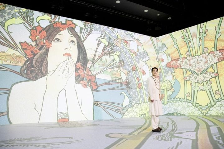 「空間に入った瞬間、ミュシャの絵に囲まれて感動しました。パリでは床が絨毯だったのが、日本では壁と一体化した映像を投影し、絵画の一部になったような没入感を味わえます。
