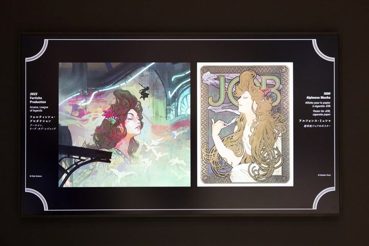 塩野さんが好きだという配信動画『アーケイン』と、もとになったと思われるポスター作品《ジョブ》。©︎2024 Mucha Trust-Grand Palais Immersif-Bunkamura