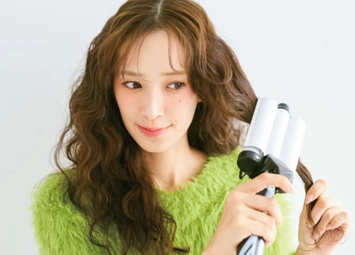 ウエーブアイロンを使って髪全体にカールをつける。髪の根元は1㎝ほど浮かせ、頭頂部から毛先まで少しずつ挟んで全体を巻く。