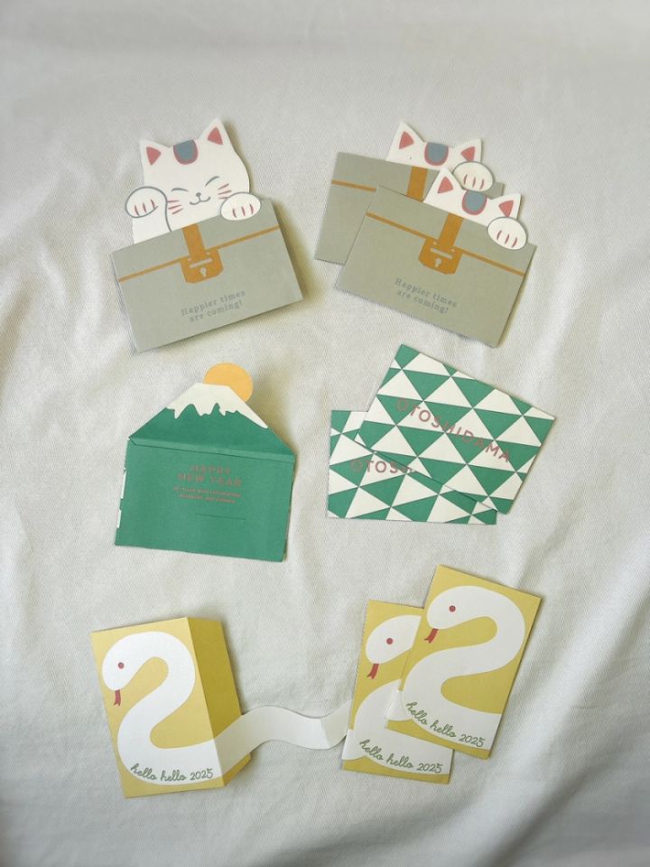 こちらはお正月らしいデザインのポチ袋です。招き猫や富士山、2025年の干支・へびをモチーフにしたデザインの3種。袋を開いたり、引っ張ったりするとデザインが変わるギミックつきで、遊び心も◎お年玉だけではなく、ちょっとしたプレゼントにも使えそうです♪