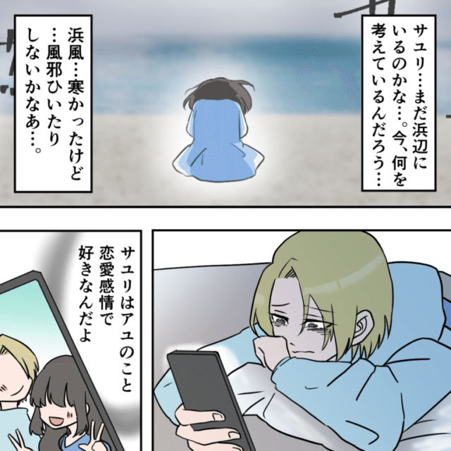 サユリの彼氏でありアユが思いを寄せていたタクマは、本気で好きだったサユリが彼女になってもなおアユのことばかりでいつまでも自分のことを好きにならないことに不満を募らせ、とうとうサユリが本当はアユのことが恋愛感情で好きで、タクマに邪魔されたくないがためにタクマと付き合ったのだという衝撃の事実を2人の前で明かしました。自分の気持ちを明かさずに『親友』としてずっとアユのそばにいたかったサユリはタクマに怒りをぶつけました。「一人にして」というサユリを海岸に残し、ひとまずはロッジに戻ったアユでしたが、いつまでも戻らないサユリのことが心配でした。