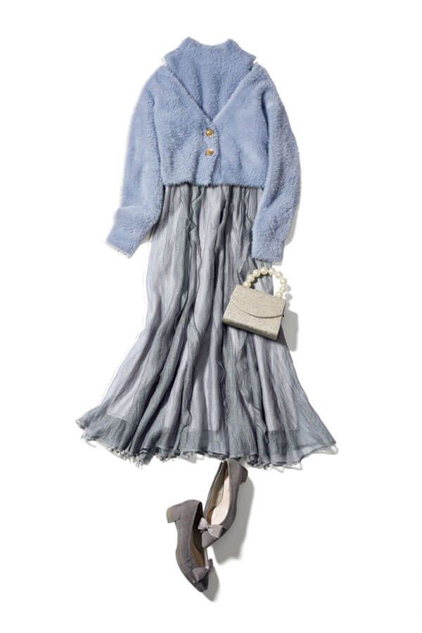 アンサンブルで旬なレイヤードスタイルと肌見せを楽しんで♡ 上半身にボリュームがあるぶん、シアースカートでバランス調整を。