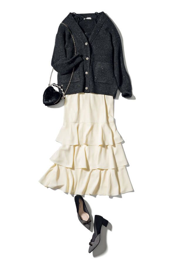 カーディガン¥13,200、キャミソール¥5,390/ともにリリアン カラット スカート¥13,200/31 Sons de mode(ヒロタ) バッグ¥16,500/コエル パンプス¥17,050/ダイアナ(ダイアナ 銀座本店)